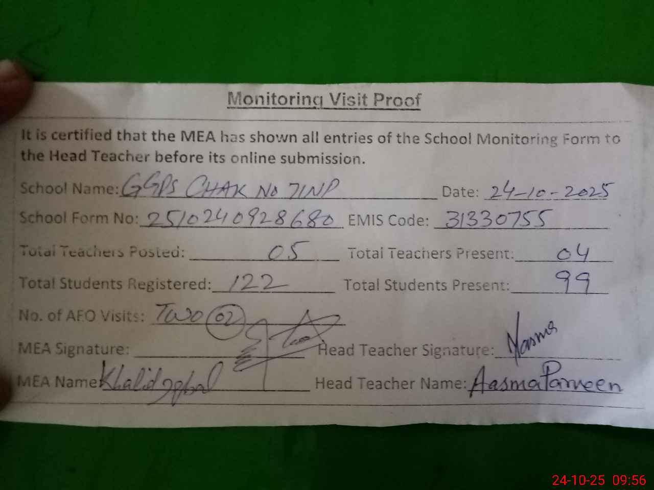 | Attendance Register | Head Teacher | MEA with School | Visit Proof |
