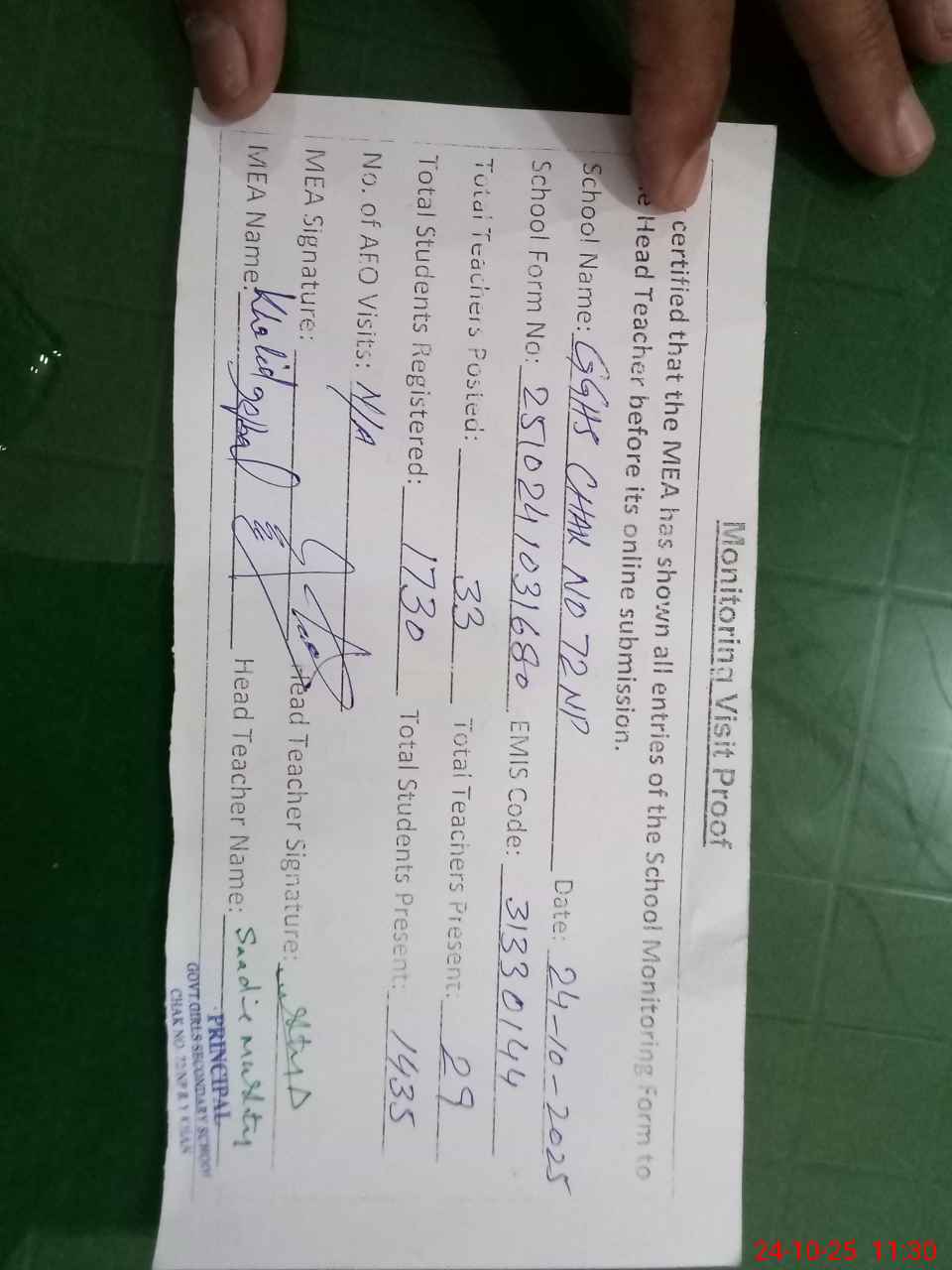 | Attendance Register | Head Teacher | MEA with School | Visit Proof |