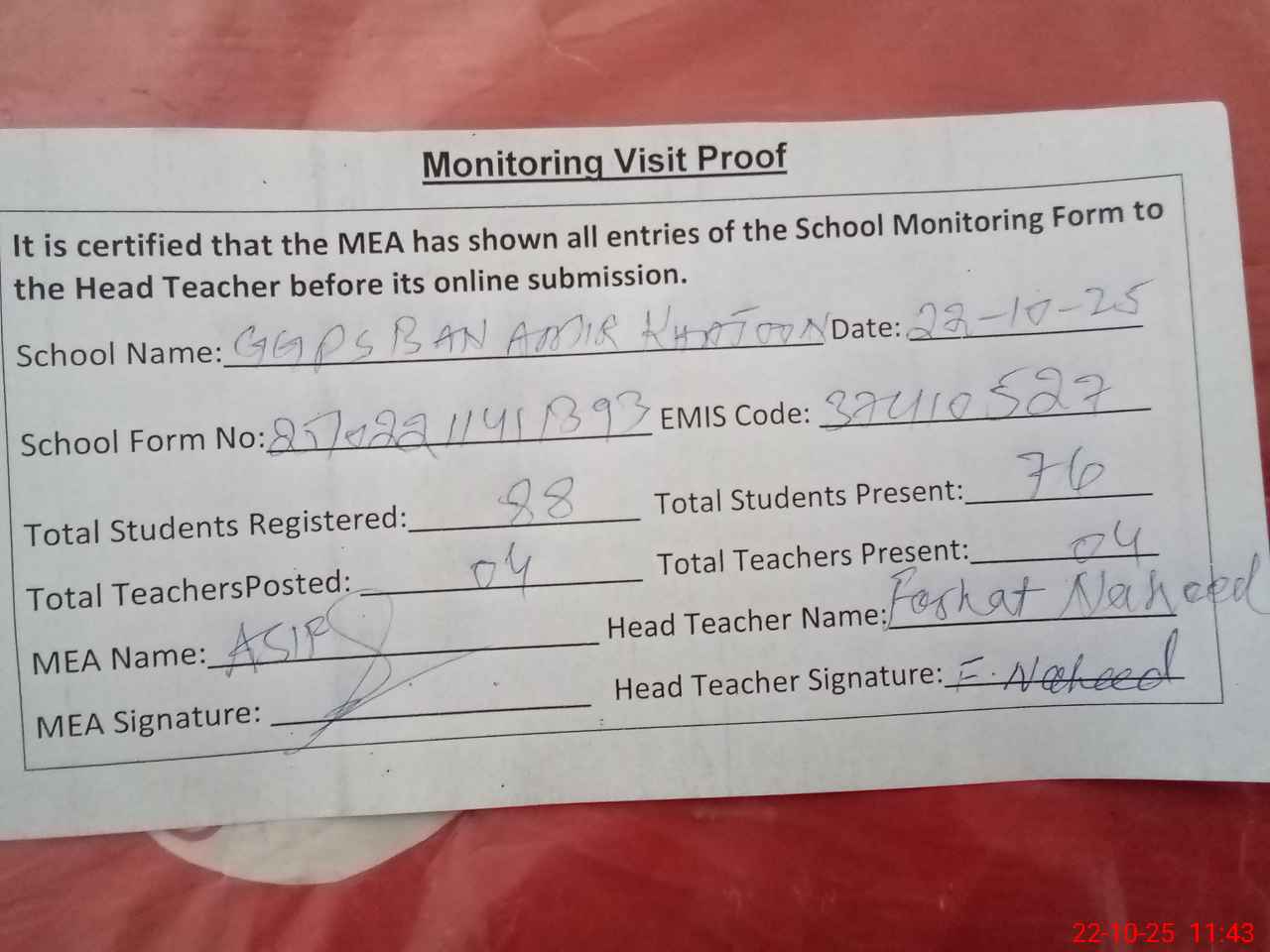 | Attendance Register | Head Teacher | MEA with School | Visit Proof |