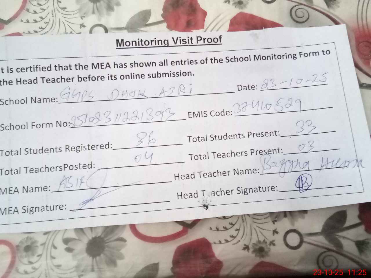 | Attendance Register | Head Teacher | MEA with School | Visit Proof |