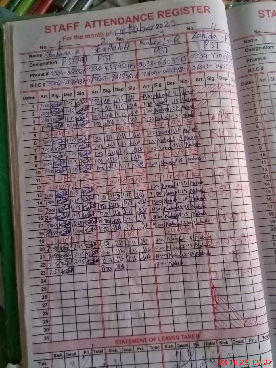 | CNIC | Full Name | Designation | R/C | Absence During Last Calender Month |