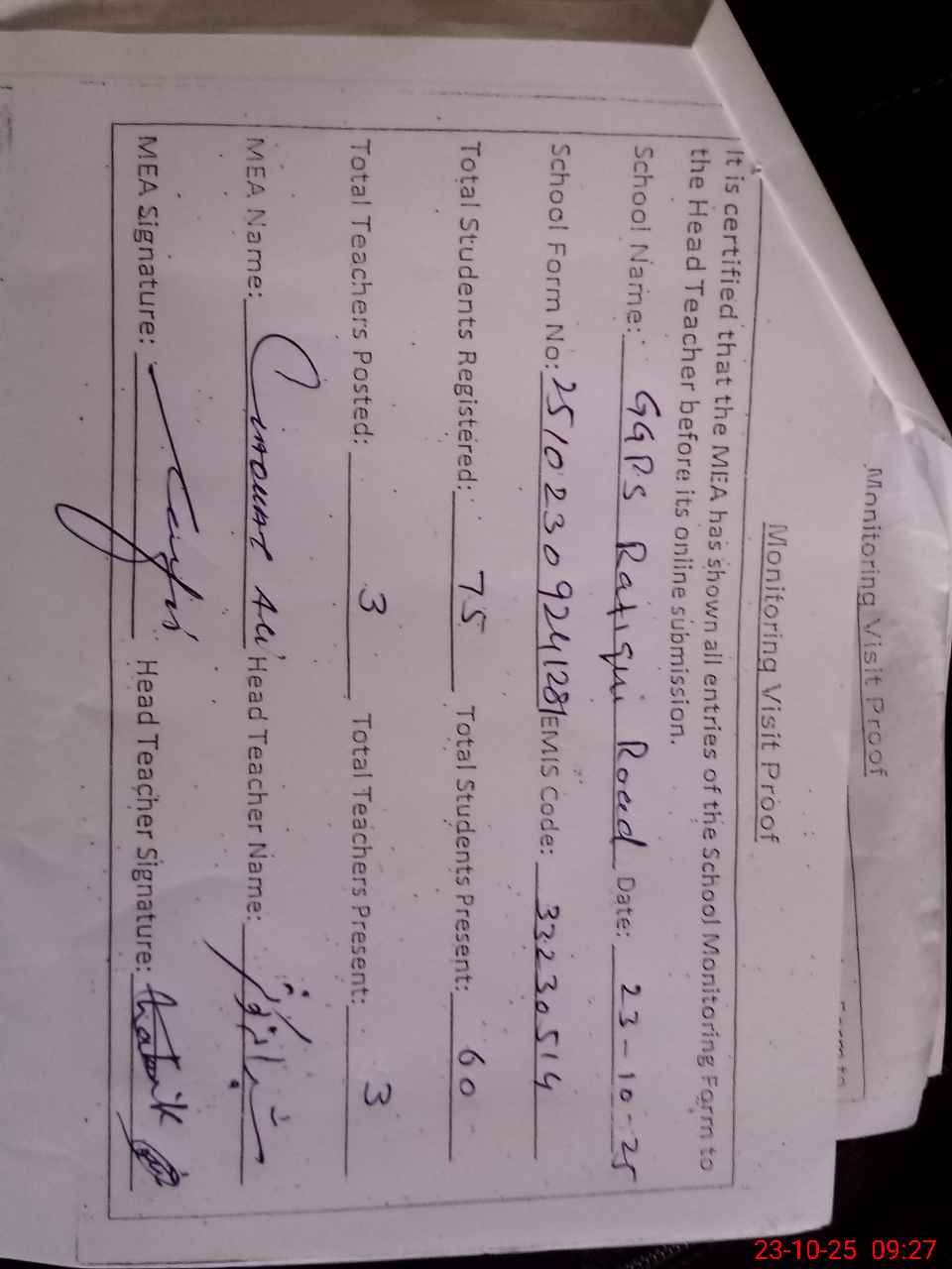 | Attendance Register | Head Teacher | MEA with School | Visit Proof |