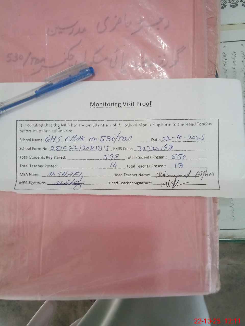 | EMIS Code: 32320168 | Name of School: GHS CHAK NO. 530/TDA | |||