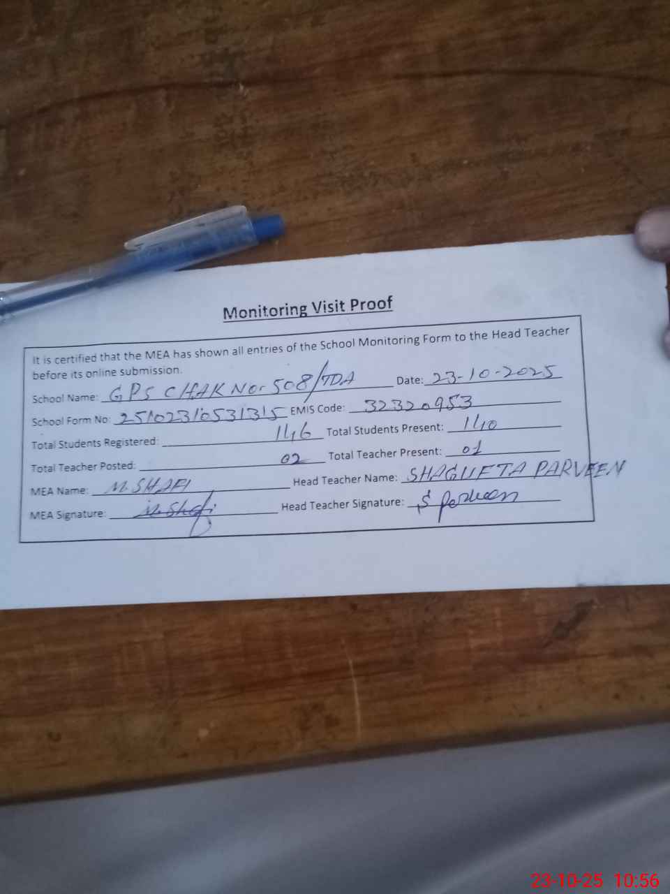 | Attendance Register | Head Teacher | MEA with School | Visit Proof |