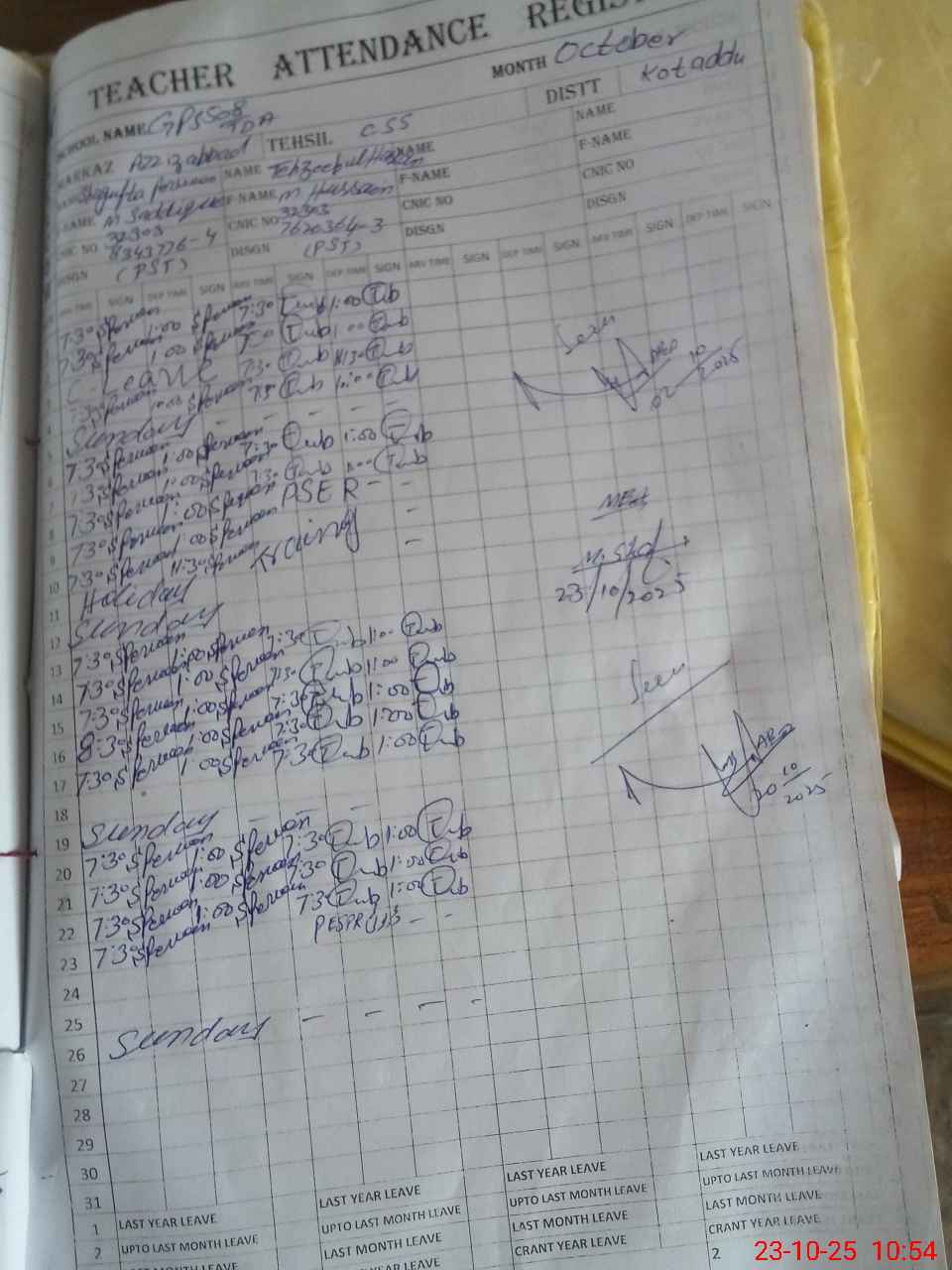 | CNIC | Full Name | Designation | R/C | Absence during last cal. month |