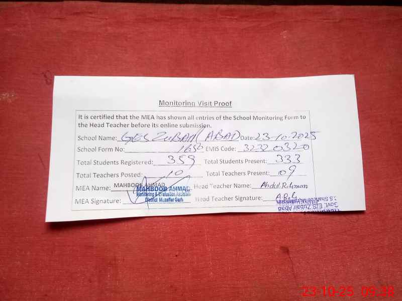 | EMIS Code: 32320320 | Name of School: GES ZUBAIR ABAD (CHAK NO. 617/TDA) | |||