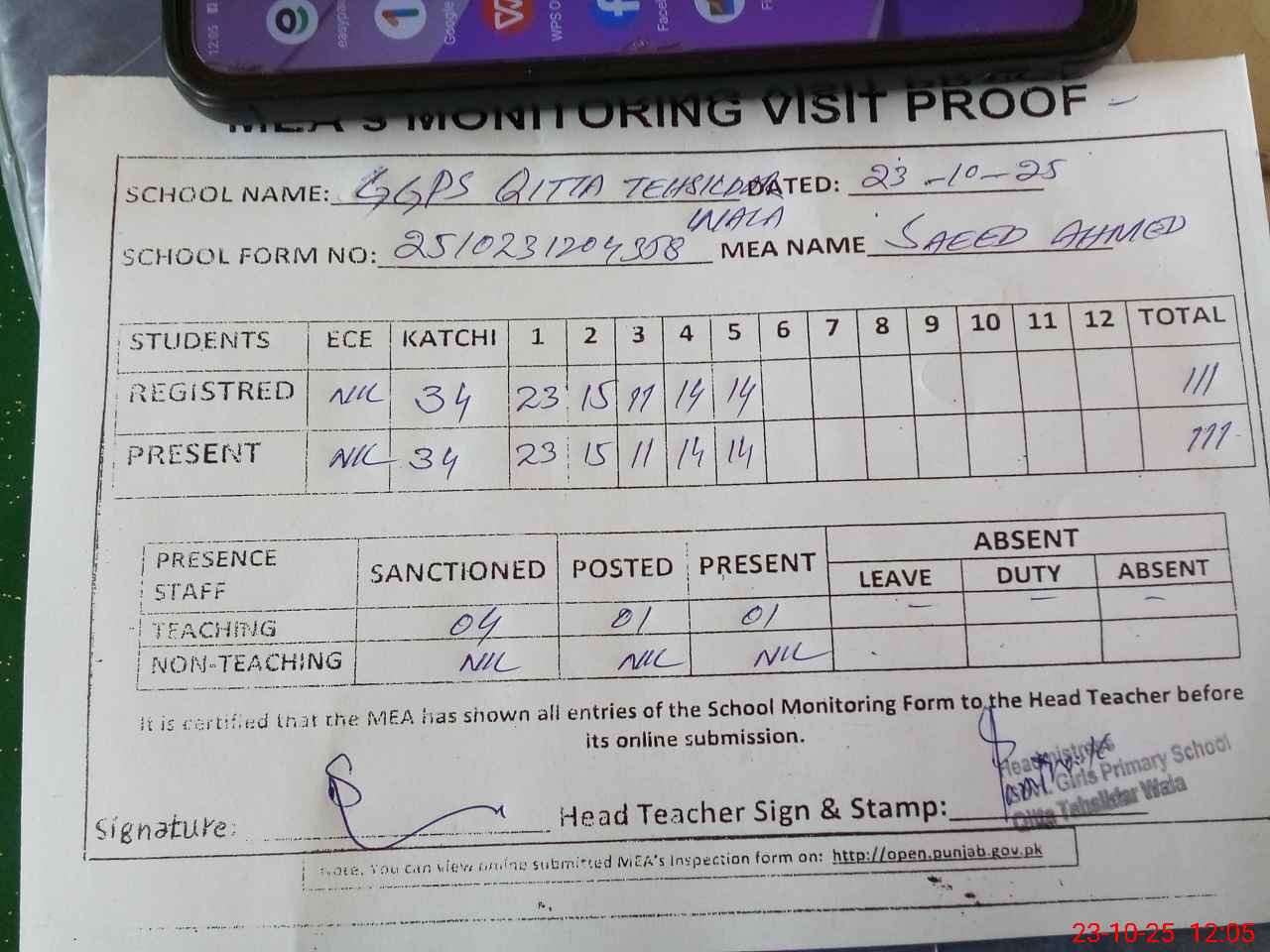 | Attendance Register | Head Teacher | MEA with School | Visit Proof |