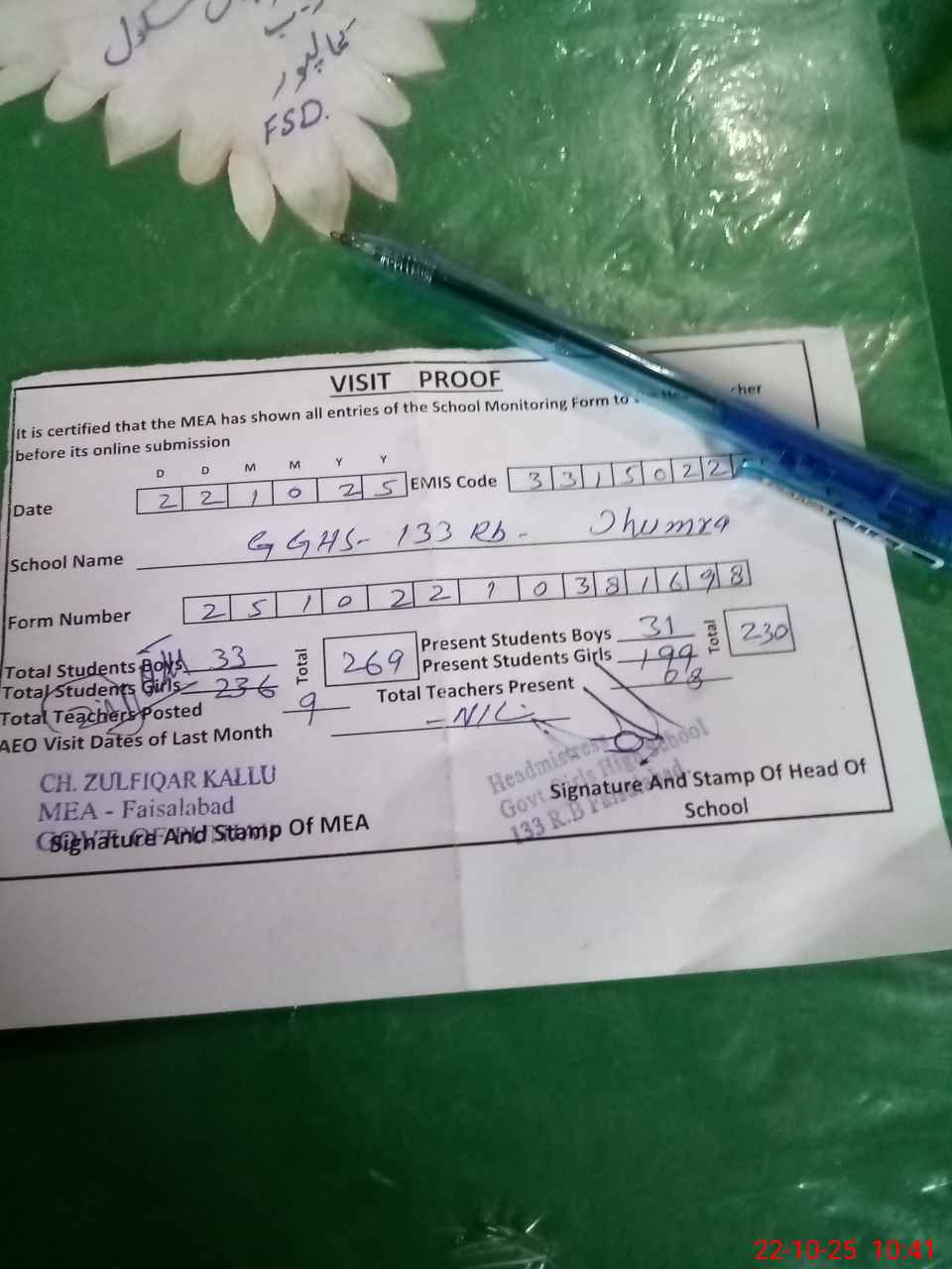 | EMIS Code: 33150225 | Name of School: GGHS CHAK 133 RB KAMAL PUR FSD | |||