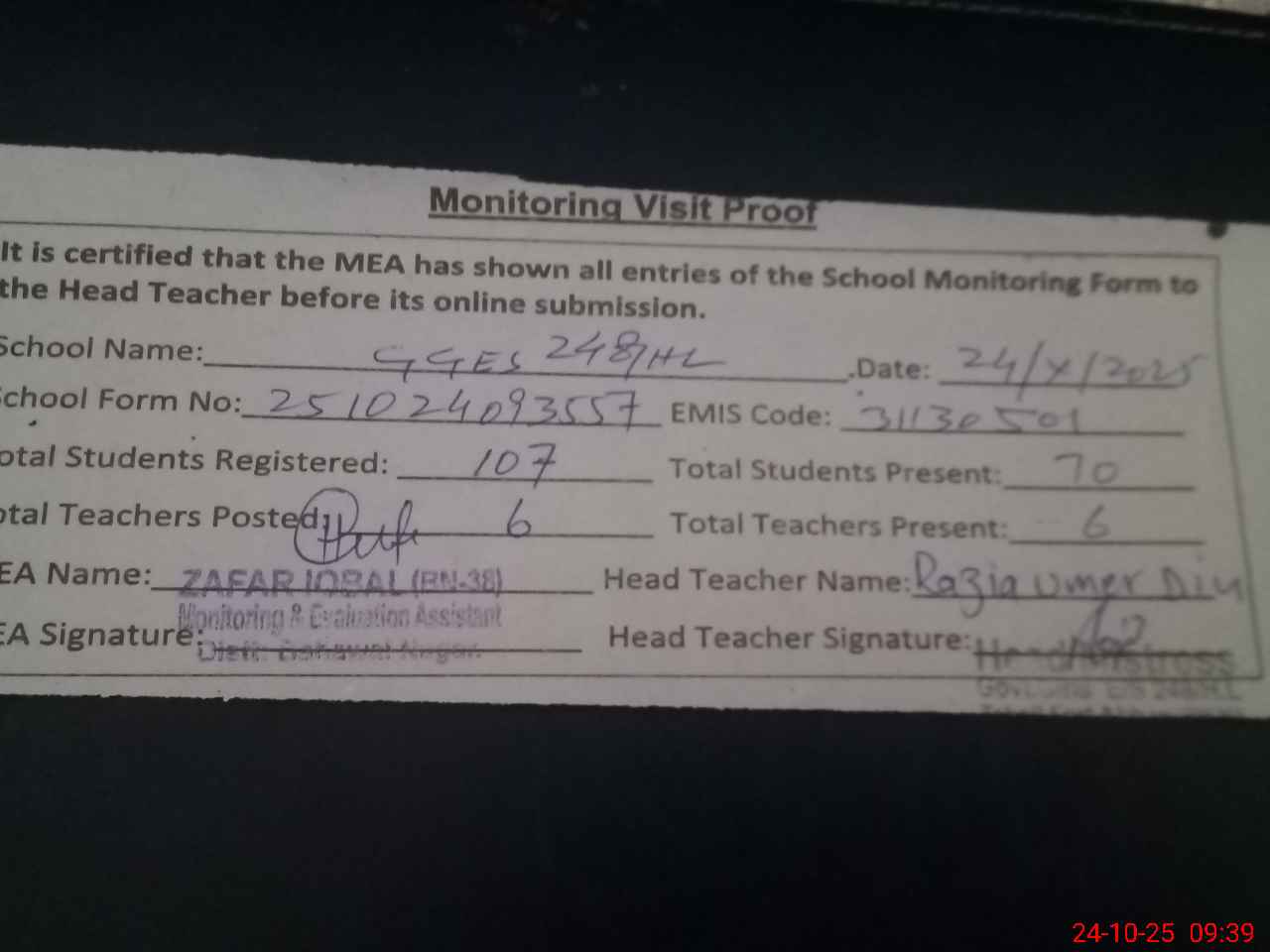 | Attendance Register | Head Teacher | MEA with School | Visit Proof |