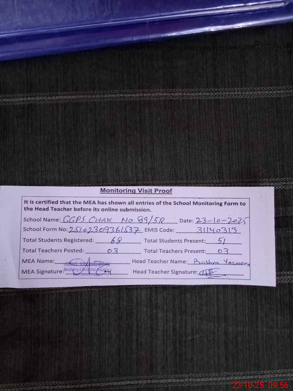 | Attendance Register | Head Teacher | MEA with School | Visit Proof |