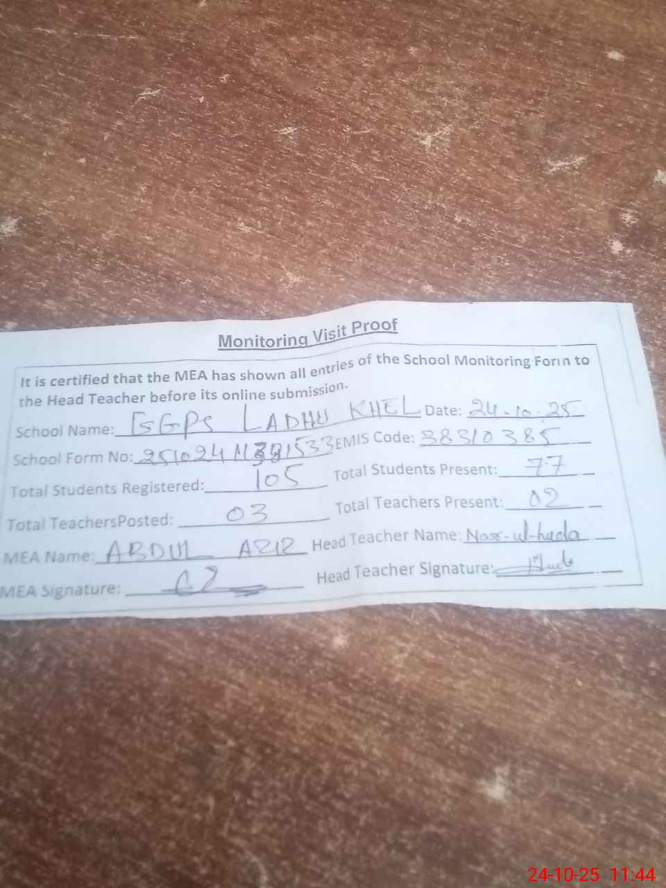 | Attendance Register | Head Teacher | MEA with School | Visit Proof |