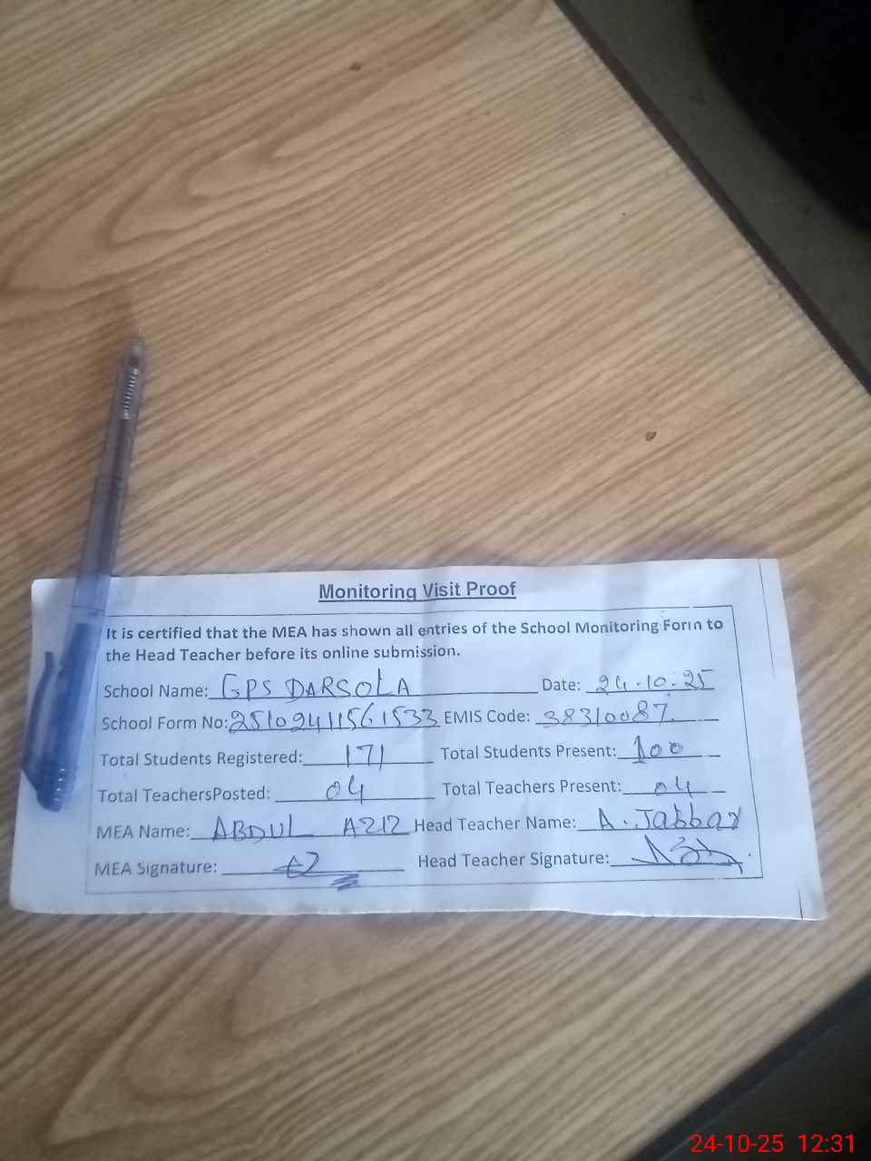 | Attendance Register | Head Teacher | MEA with School | Visit Proof |