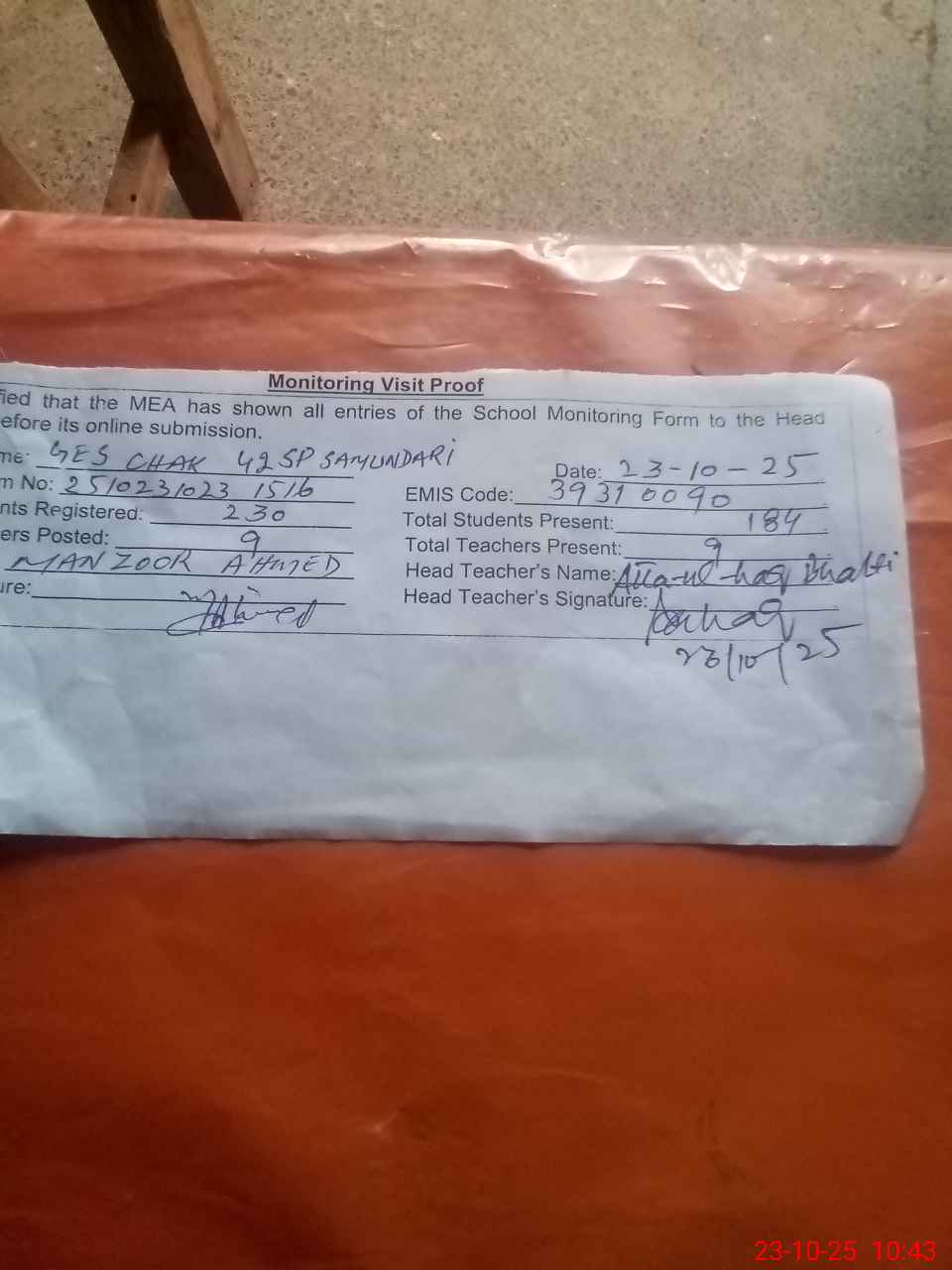 | Attendance Register | Head Teacher | MEA with School | Visit Proof |
