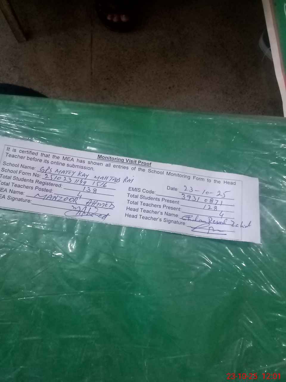 | Attendance Register | Head Teacher | MEA with School | Visit Proof |
