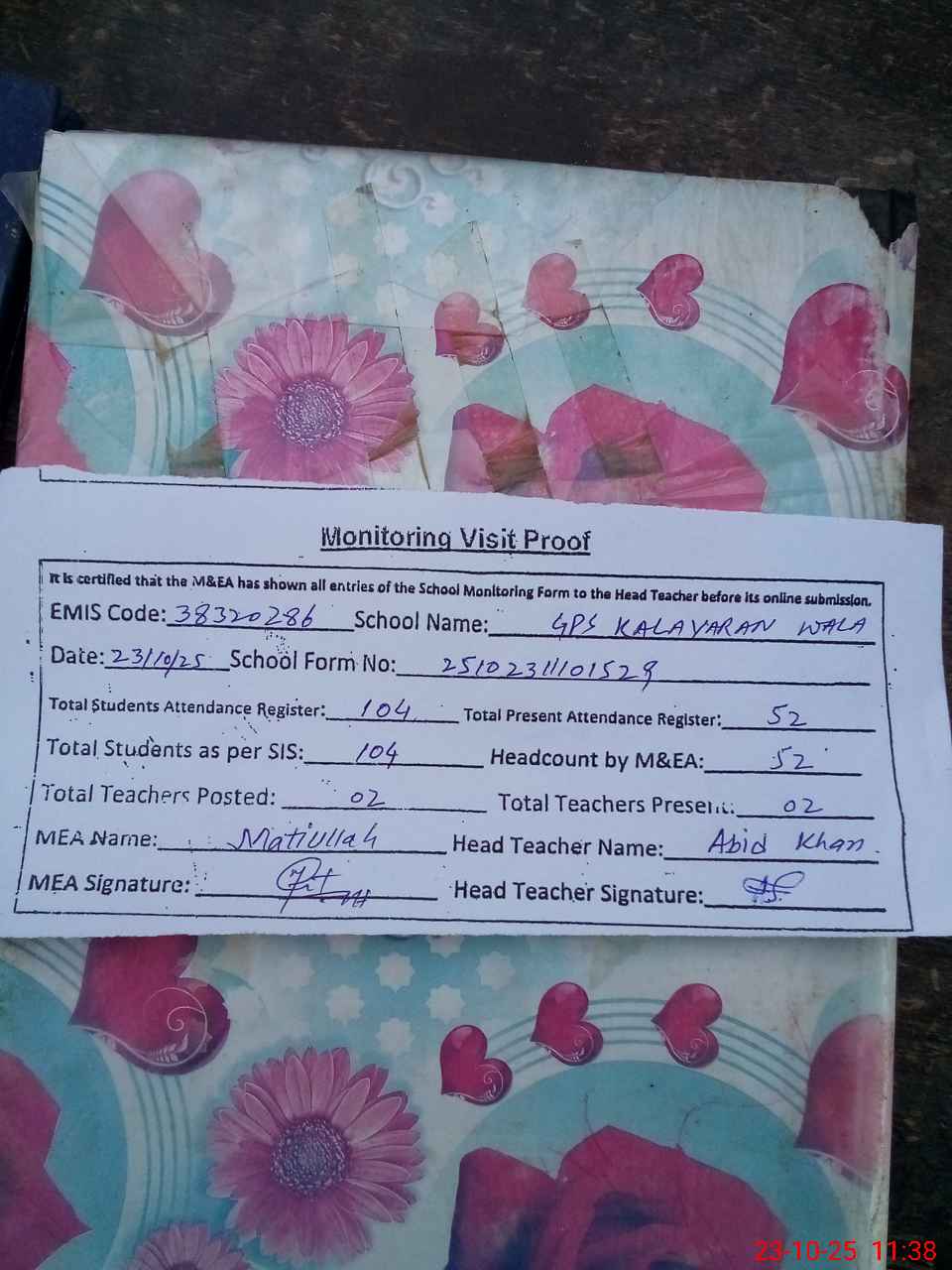 | Attendance Register | Head Teacher | MEA with School | Visit Proof |