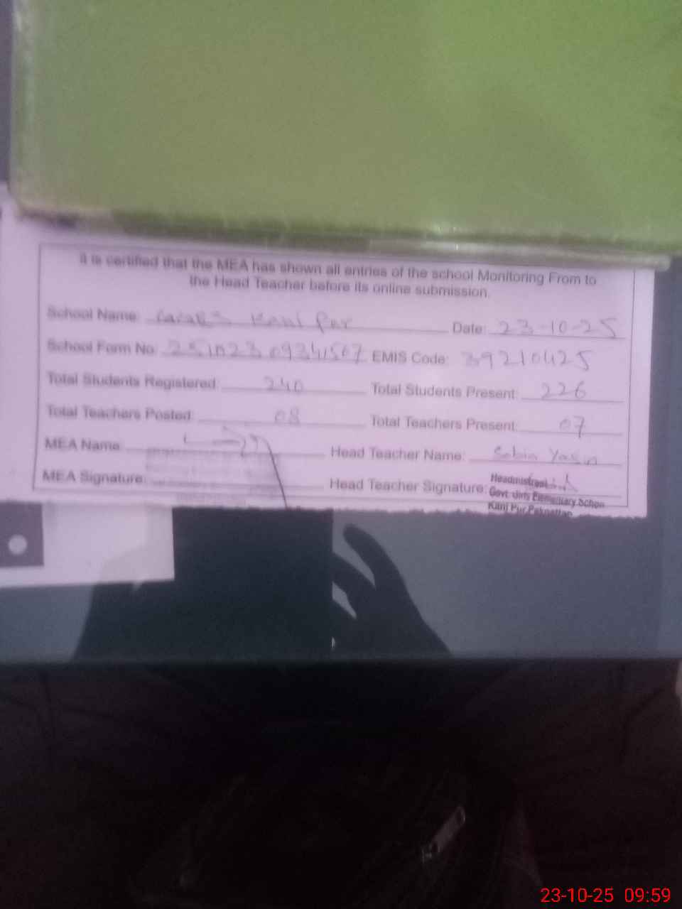 | Certified that this School was Inspected by the Undersigned MEA/DMO Today and the Information Stated Above is as Per Record. | |||||
