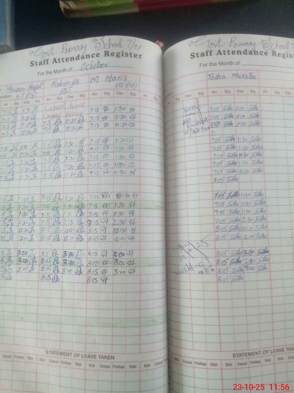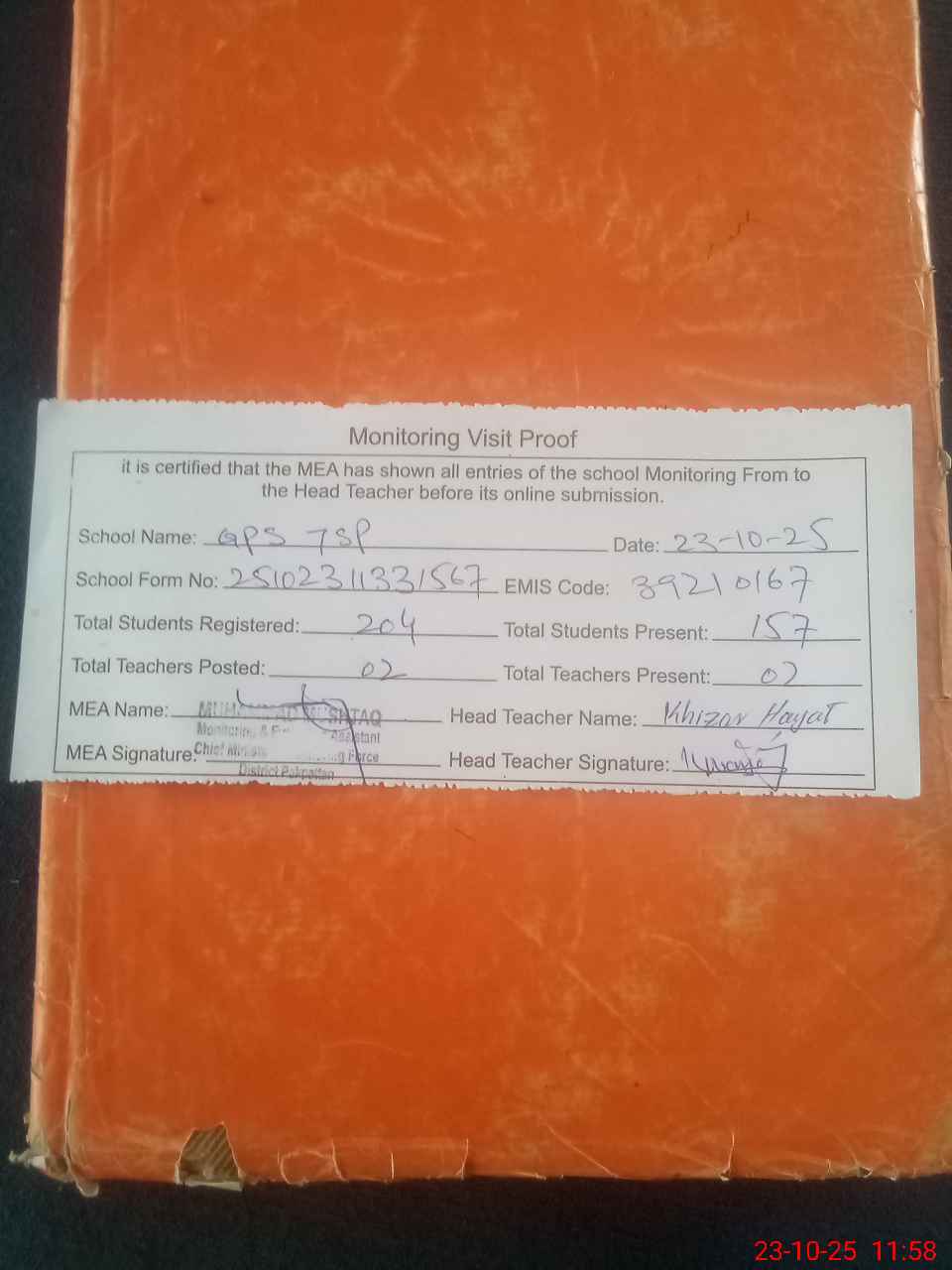 | Attendance Register | Head Teacher | MEA with School | Visit Proof |