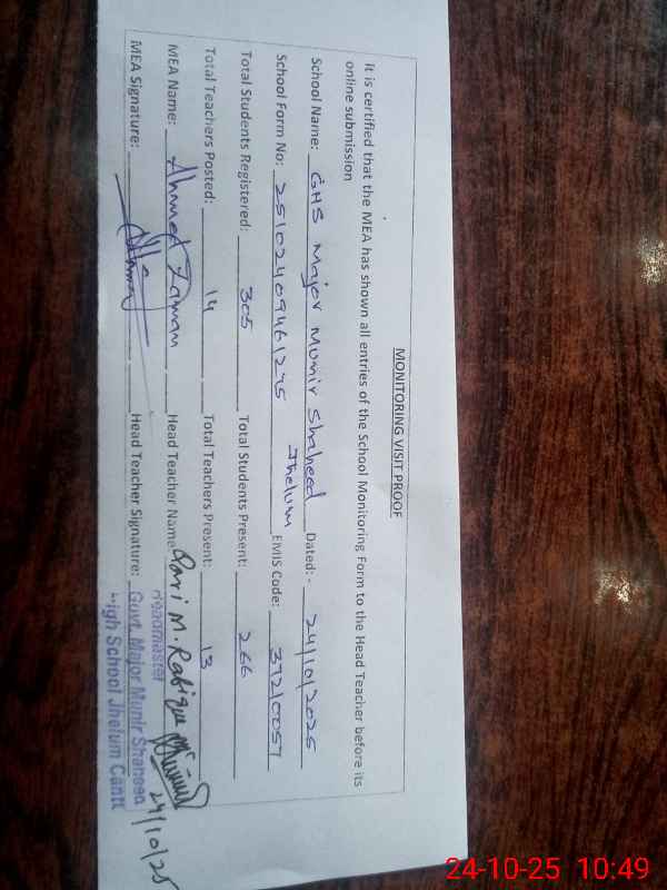 | EMIS Code: 37210057 | Name of School: GHS MAJOR MUNEER SHAHEED JHELUM CANTT | |||