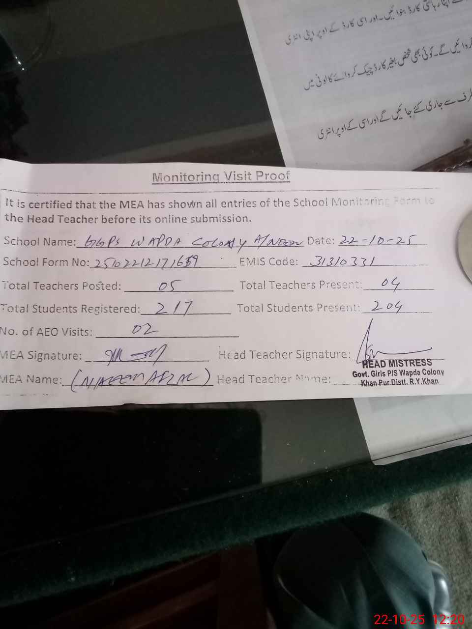 | EMIS Code: 31310331 | Name of School: GGPS WAPDA COLONY (After Noon) | |||