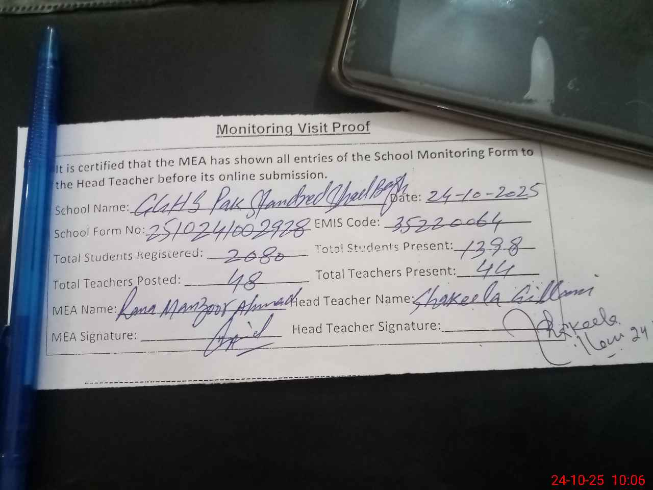 | Certified that this School was Inspected by the Undersigned MEA/DMO Today and the Information Stated Above is as Per Record. | |||||