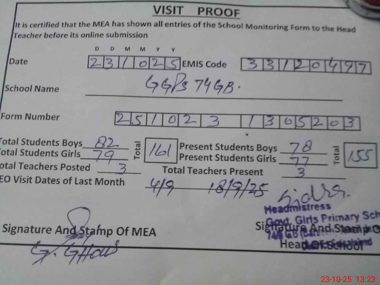 | Attendance Register | Head Teacher | MEA with School | Visit Proof |
