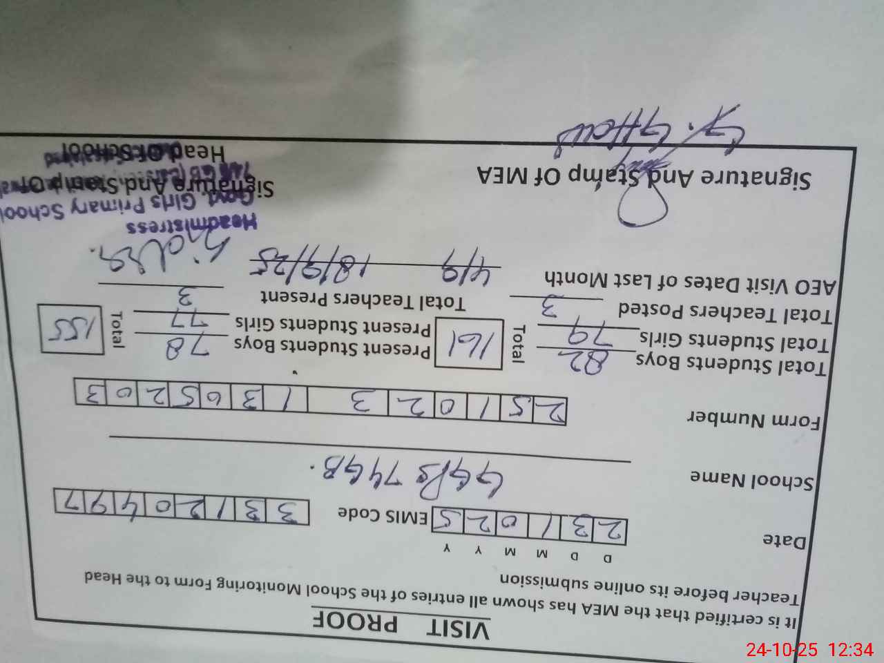 | Attendance Register | Head Teacher | MEA with School | Visit Proof |