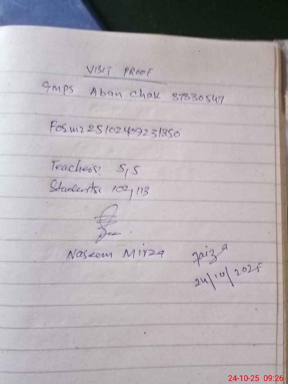 | Attendance Register | Head Teacher | MEA with School | Visit Proof |