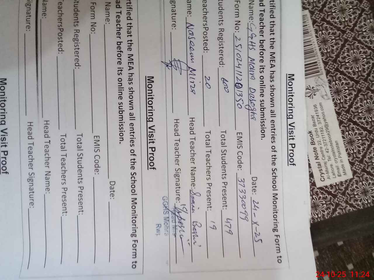 | Attendance Register | Head Teacher | MEA with School | Visit Proof |