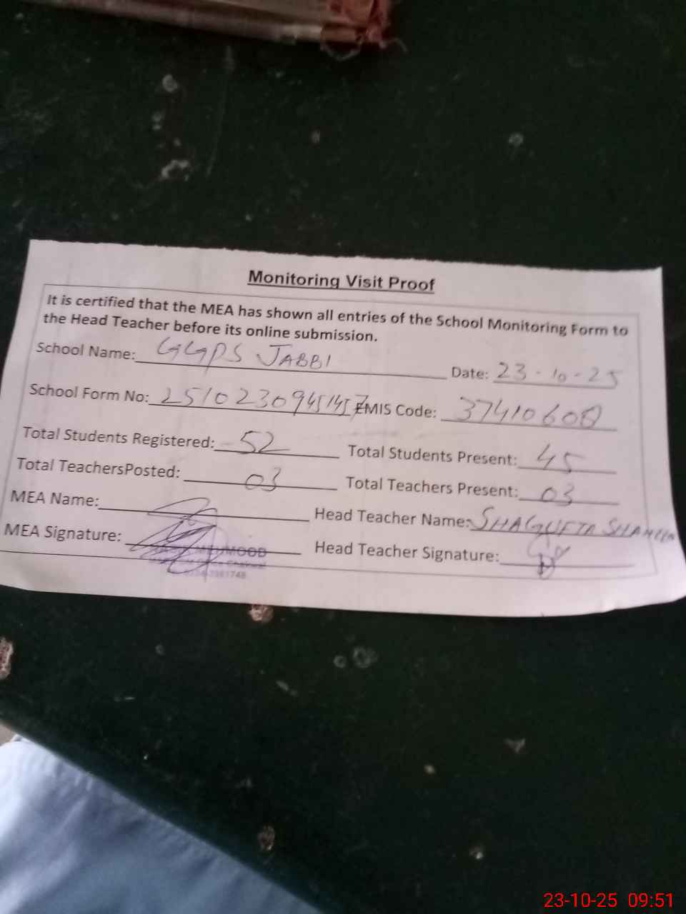 | Attendance Register | Head Teacher | MEA with School | Visit Proof |