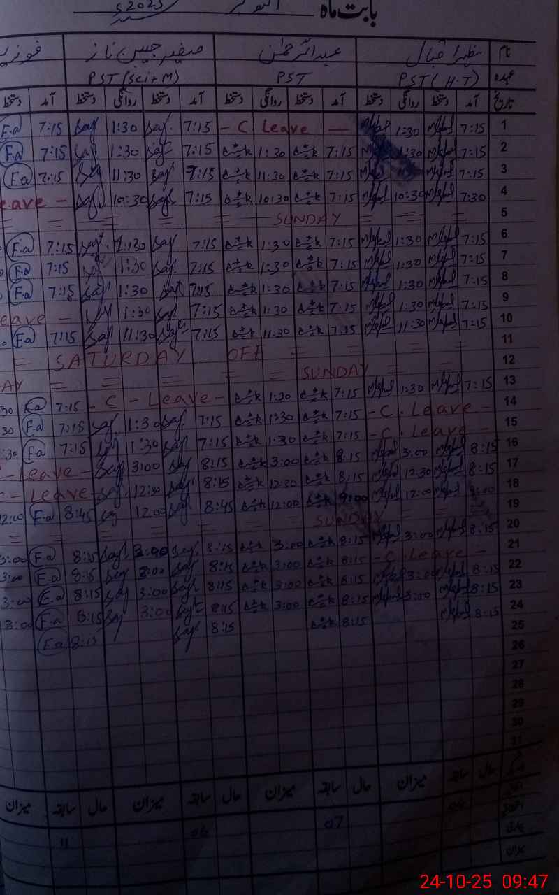 | CNIC | Full Name | Designation | R/C | Absence During Last Calender Month |