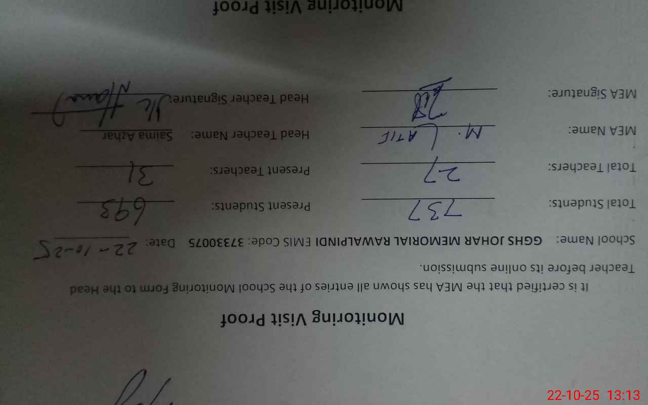 | Certified that this School was Inspected by the Undersigned MEA/DMO Today and the Information Stated Above is as Per Record. | |||||