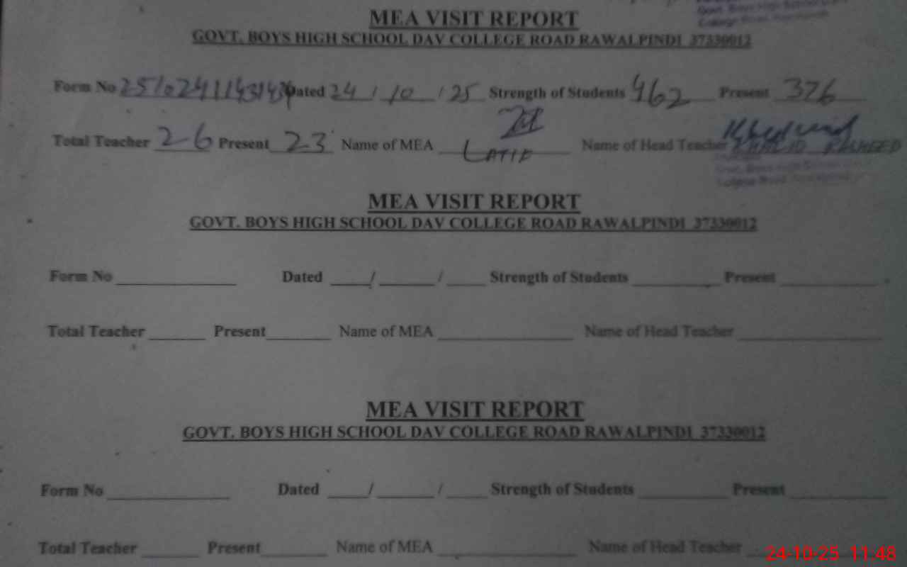 | Certified that this School was Inspected by the Undersigned MEA/DMO Today and the Information Stated Above is as Per Record. | |||||