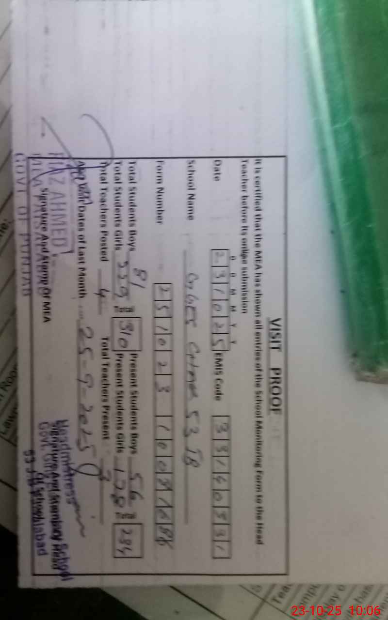 | Certified that this School was Inspected by the Undersigned MEA/DMO Today and the Information Stated Above is as Per Record. | |||||
