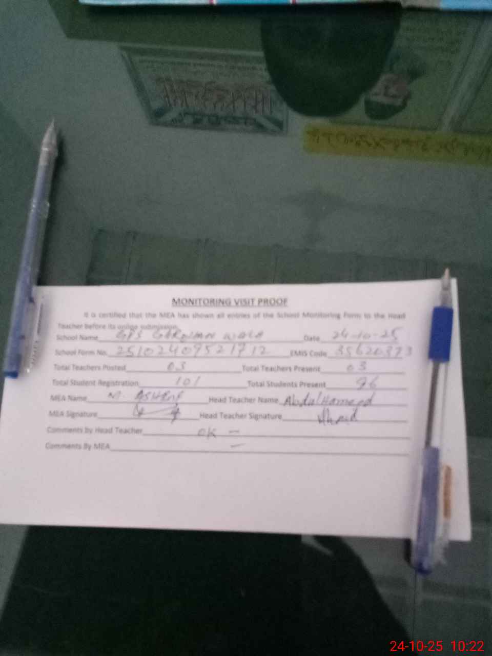 | Attendance Register | Head Teacher | MEA with School | Visit Proof |