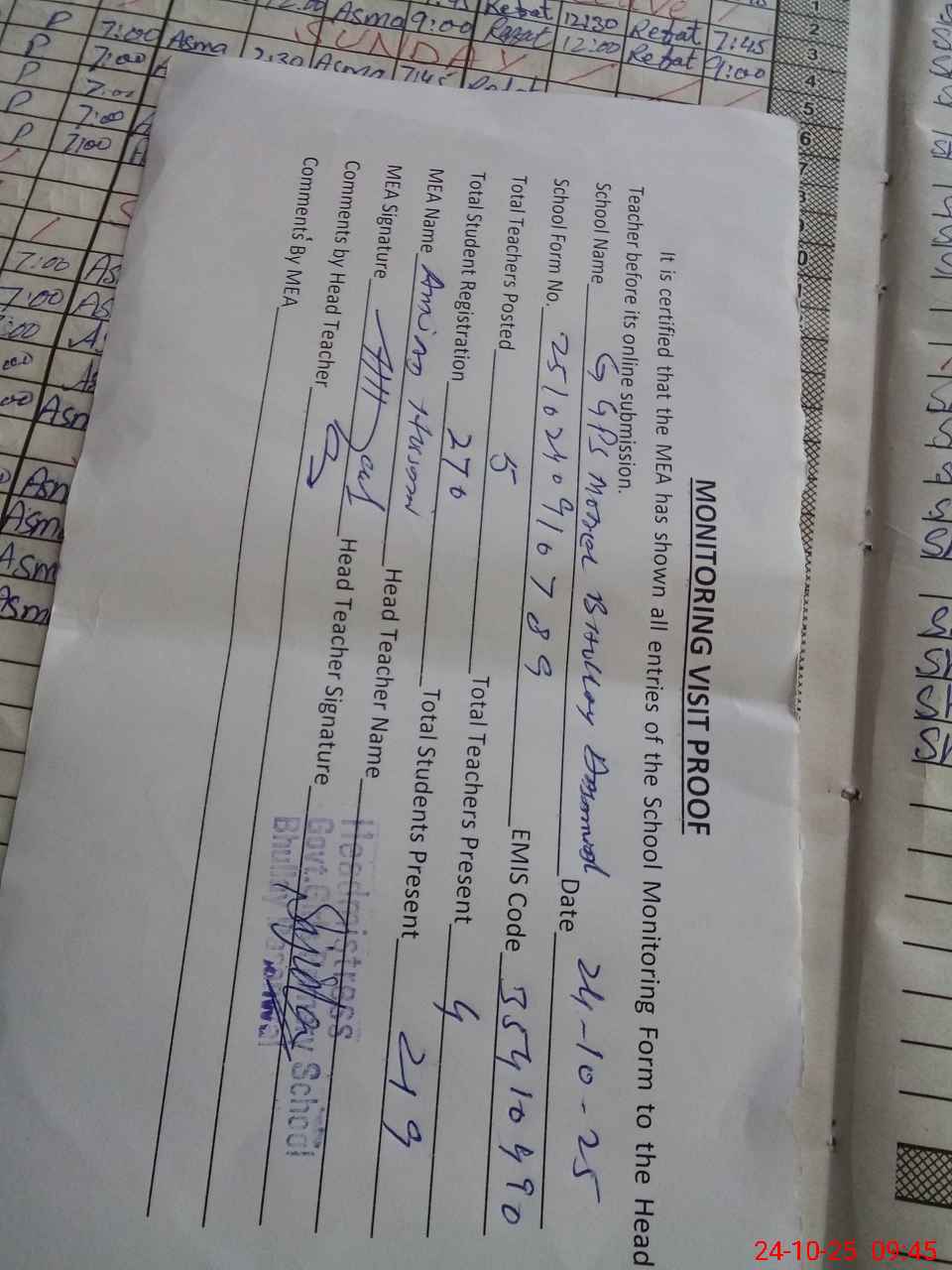 | Attendance Register | Head Teacher | MEA with School | Visit Proof |