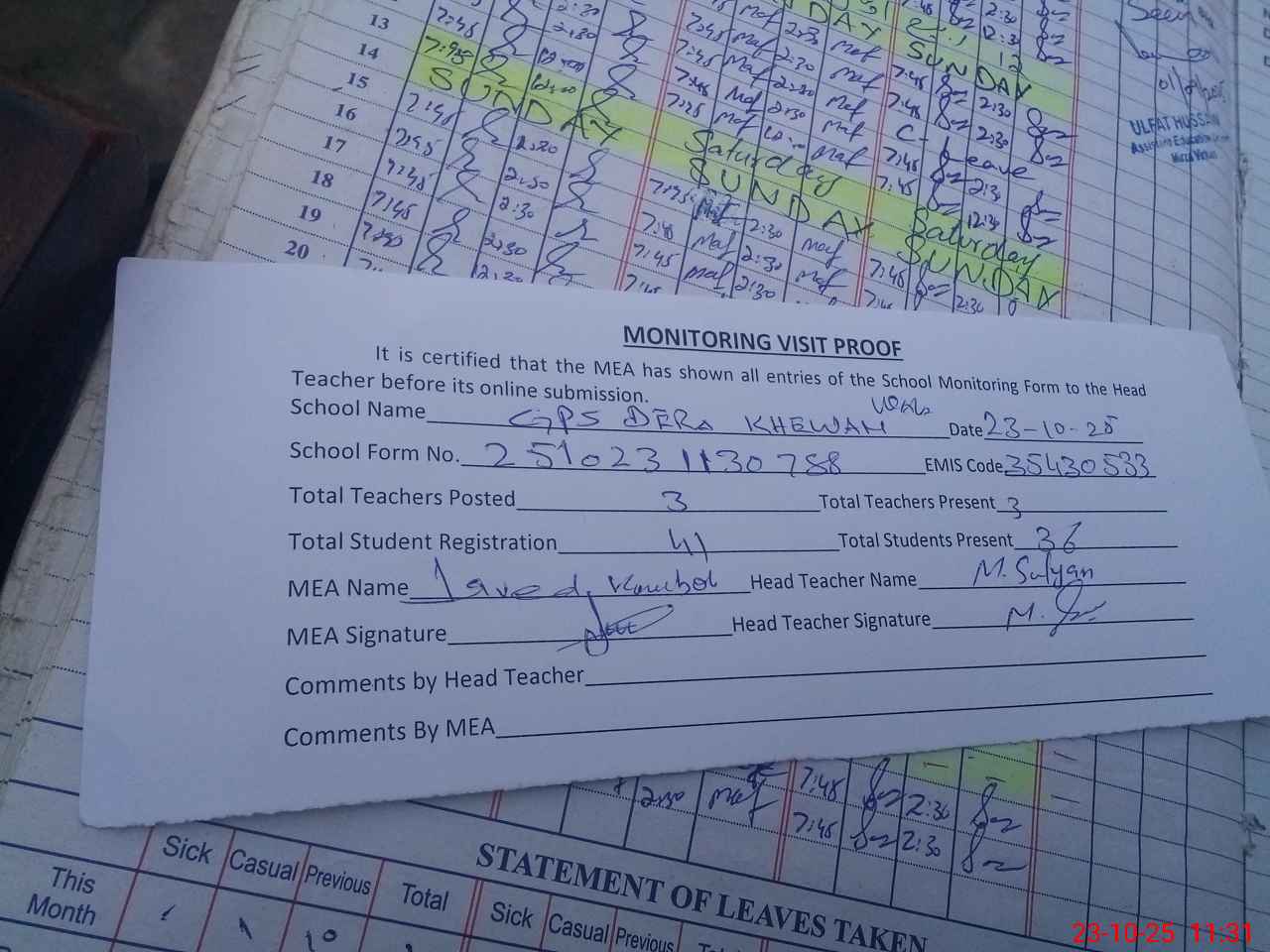 | EMIS Code: 35430533 | Name of School: GPS DERA KHEWAN WALA | |||