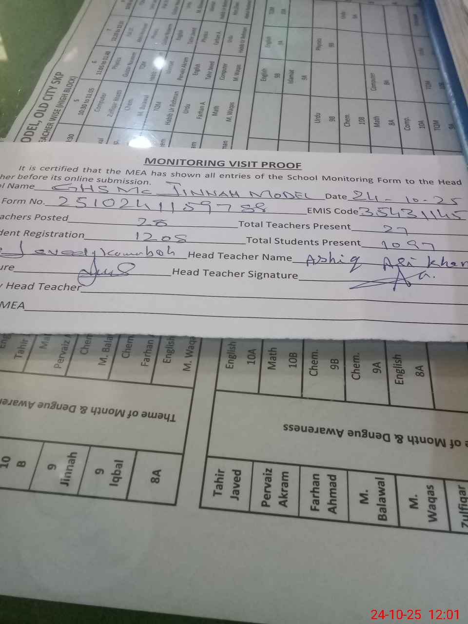 | Attendance Register | Head Teacher | MEA with School | Visit Proof |