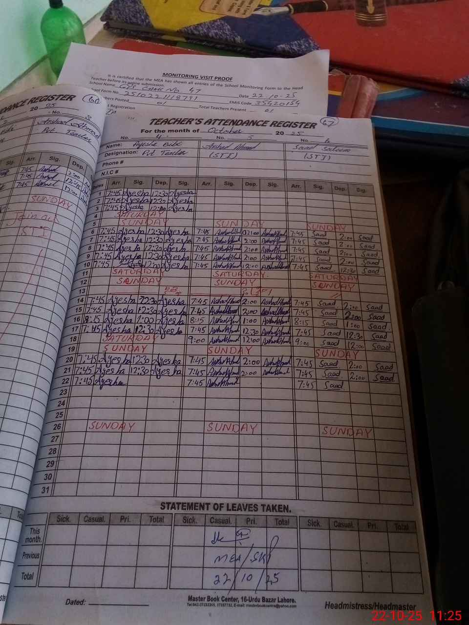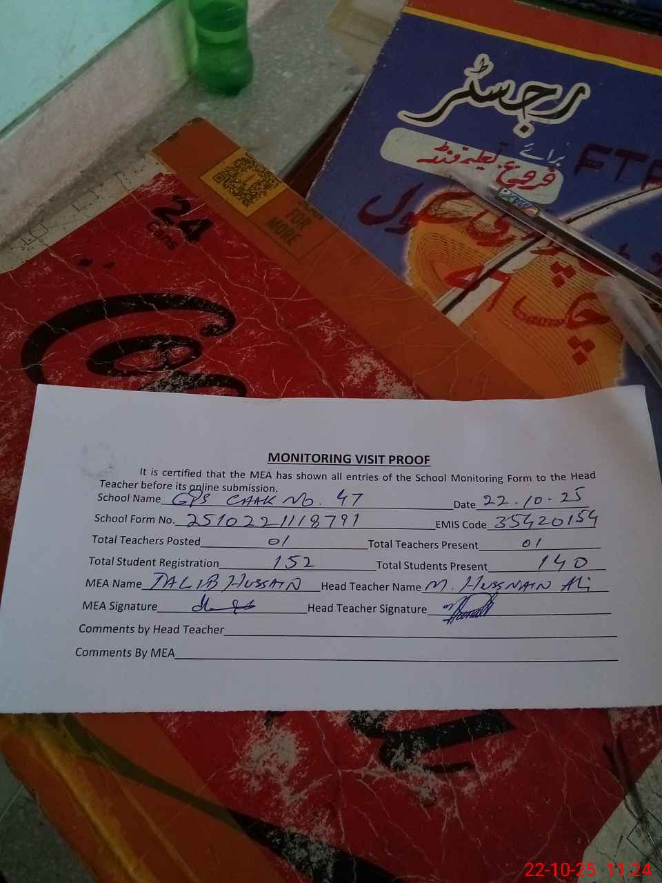 | Attendance Register | Head Teacher | MEA with School | Visit Proof |