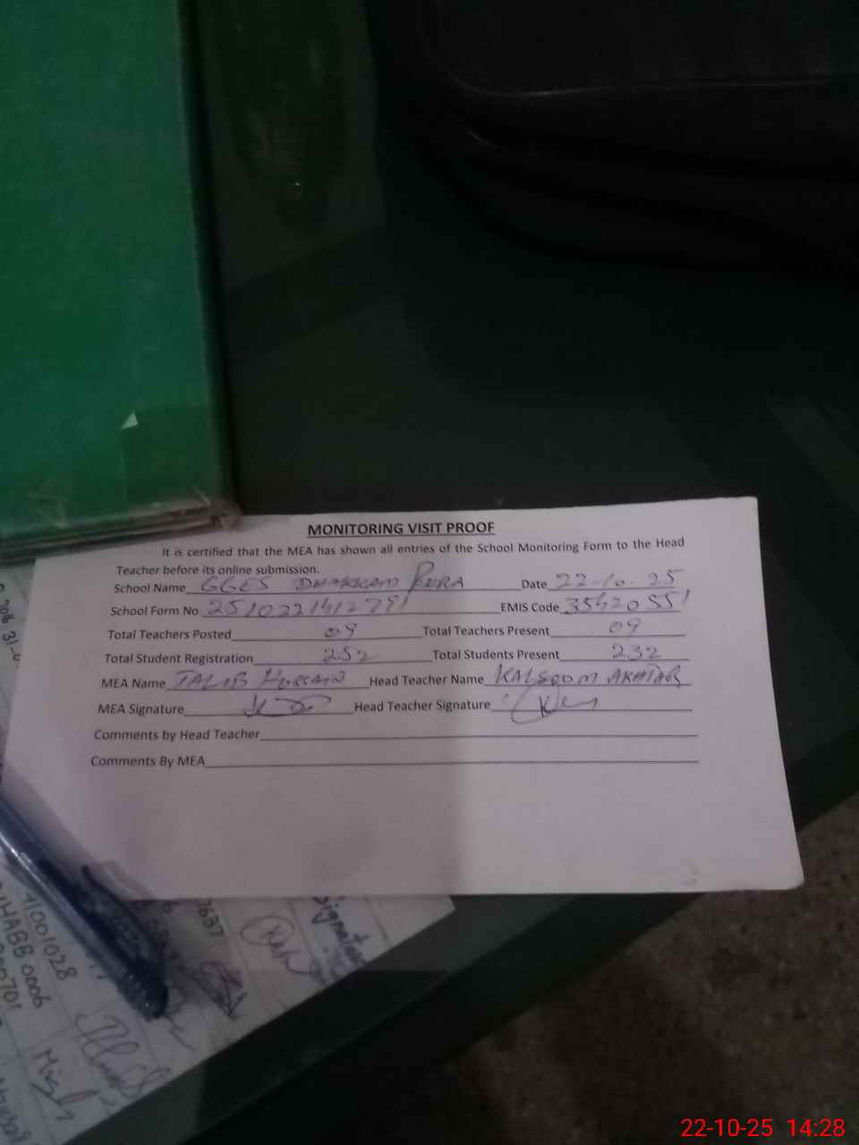 | Attendance Register | Head Teacher | MEA with School | Visit Proof |