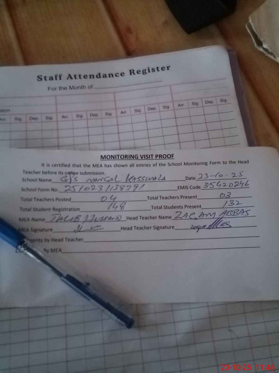 | Attendance Register | Head Teacher | MEA with School | Visit Proof |