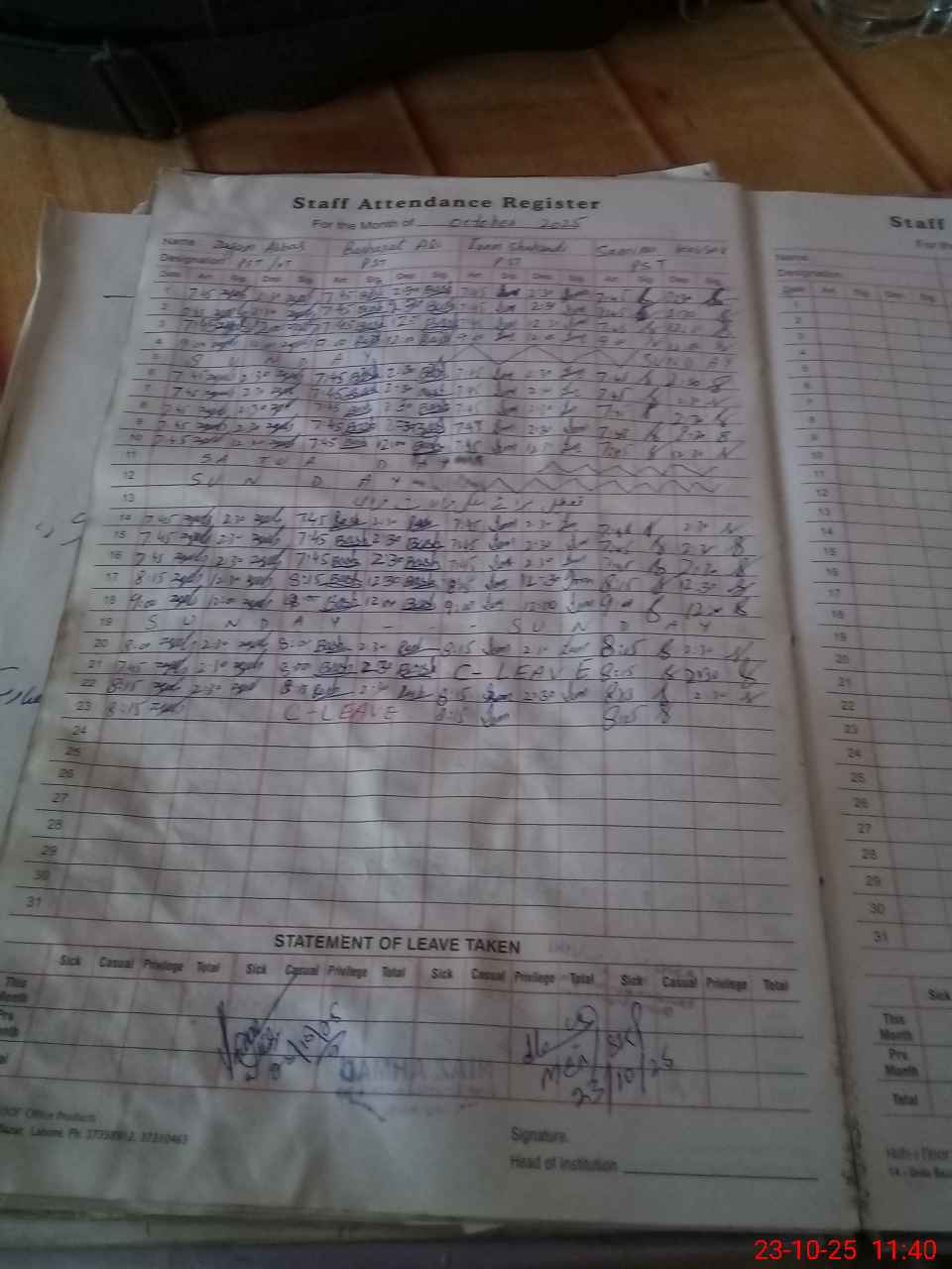 | CNIC | Full Name | Designation | R/C | Absence During Last Calender Month |