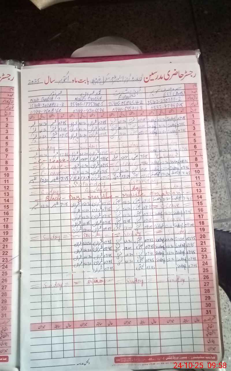 | Name: Sy**** Sa**** Fa**** Designation: (School Headmaster's/Headmistress's) EST Phone/Cell Number: 03**** |
