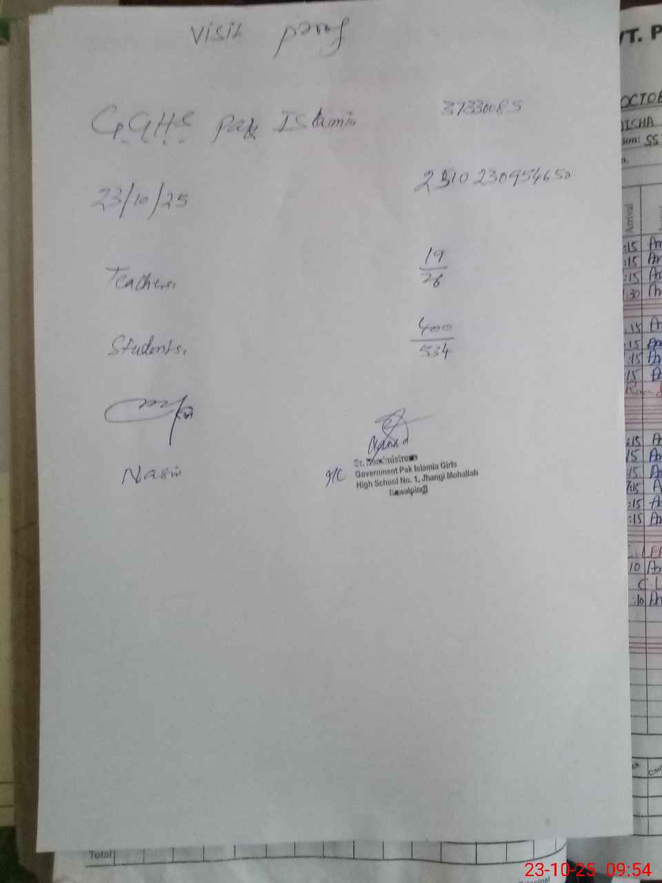 | Name: Um**** Sa**** Designation: (School Headmaster's/Headmistress's) Sr HeadmIstress Phone/Cell Number: 03**** |