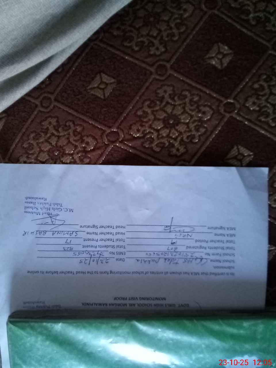 | Certified that this School was Inspected by the Undersigned MEA/DMO Today and the Information Stated Above is as Per Record. | |||||