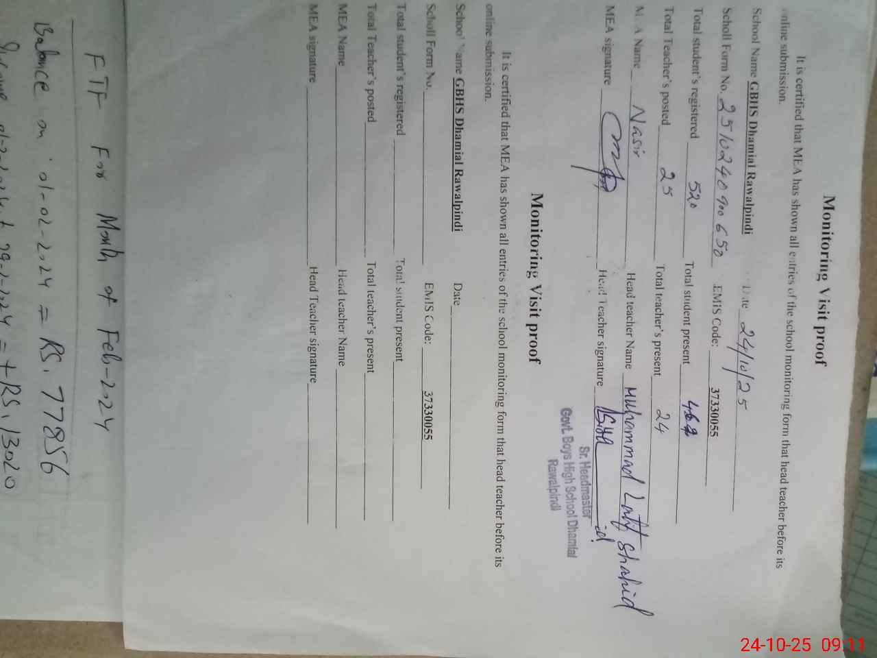 | Certified that this School was Inspected by the Undersigned MEA/DMO Today and the Information Stated Above is as Per Record. | |||||