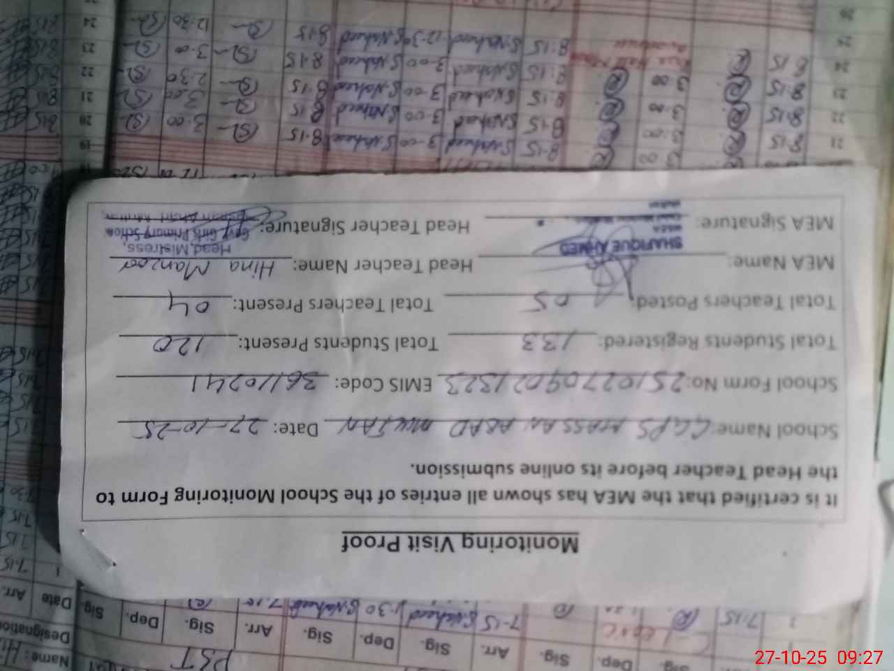 | Monitoring Date: 27-10-2025 | Start Time: 27-10-2025 09:02 AM | End Time: 27-10-2025 09:27 AM | Name of MEA: SH**** AH**** | |