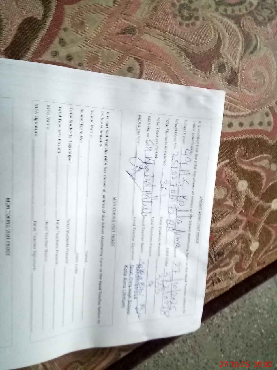 | Monitoring Date: 27-10-2025 | Start Time: 27-10-2025 08:17 AM | End Time: 27-10-2025 09:30 AM | Name of MEA: Kh**** ha**** | |