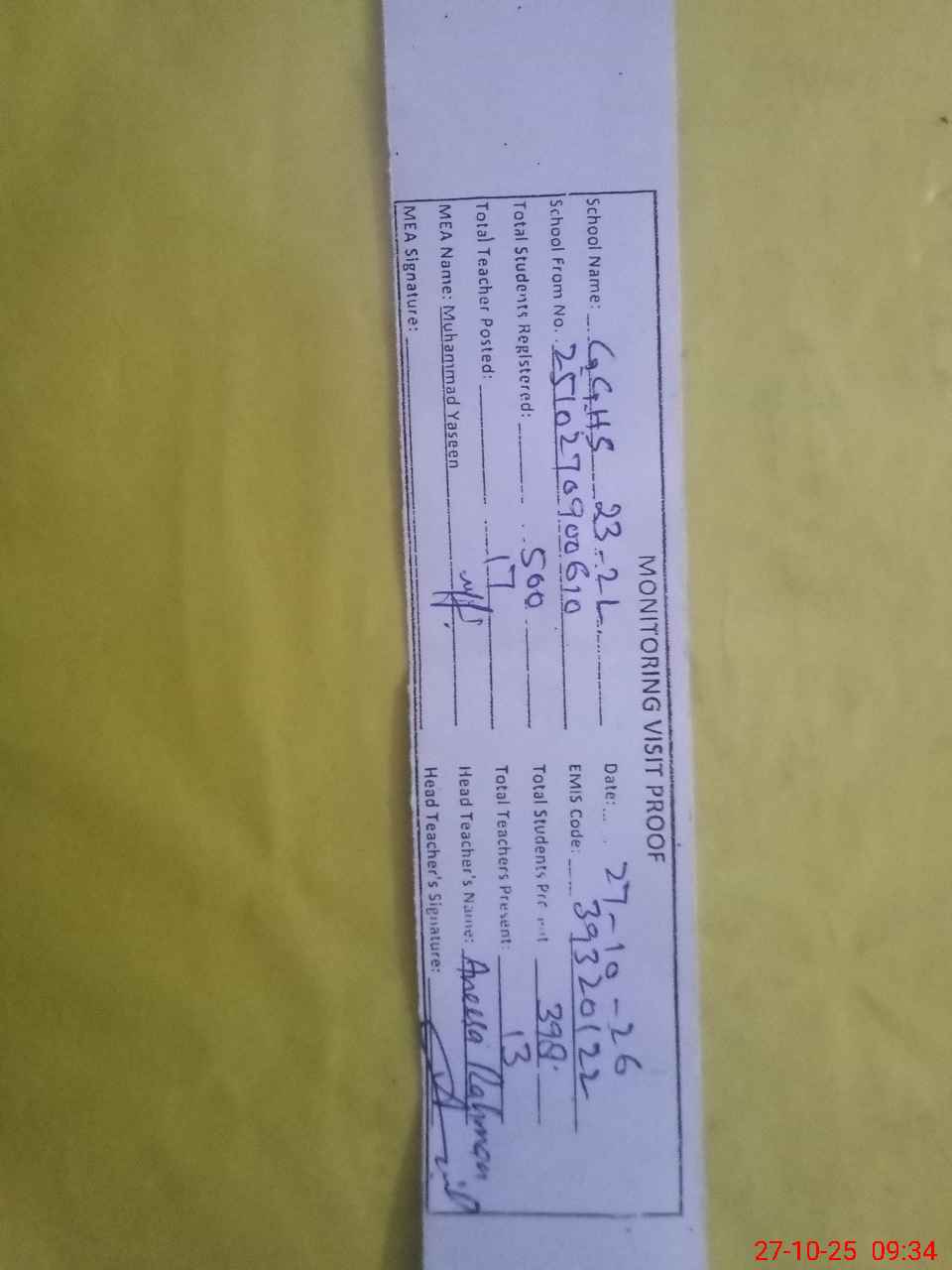 | Attendance Register | Head Teacher | MEA with School | Visit Proof |
