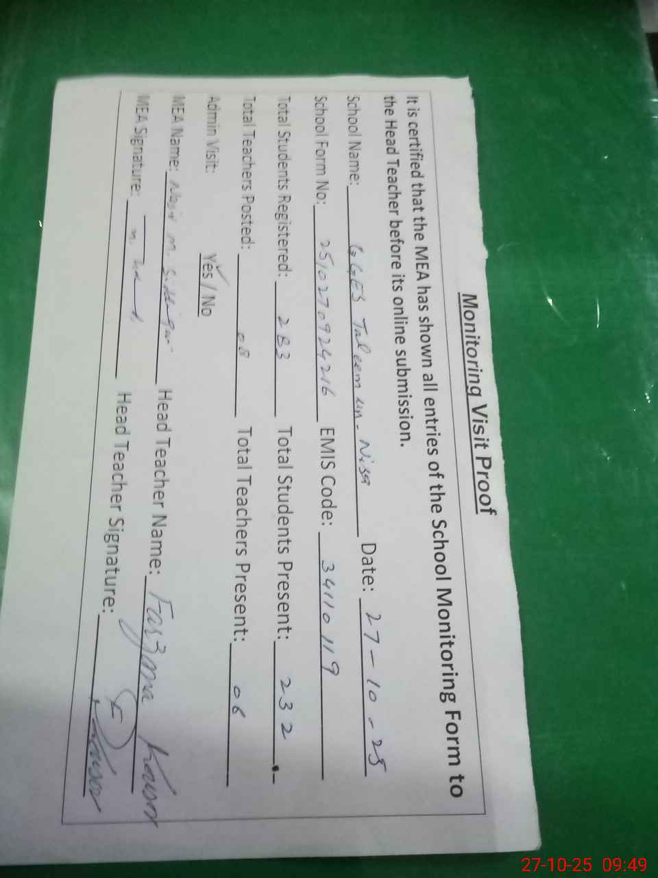 | Attendance Register | Head Teacher | MEA with School | Visit Proof |