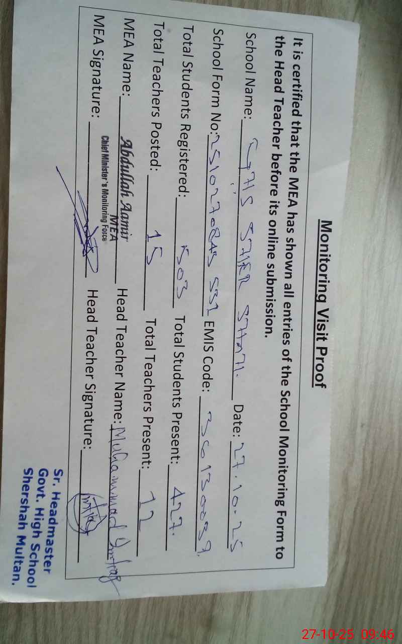 | EMIS Code: 36130039 | Name of School: GHS SHER SHAH MULTAN | |||